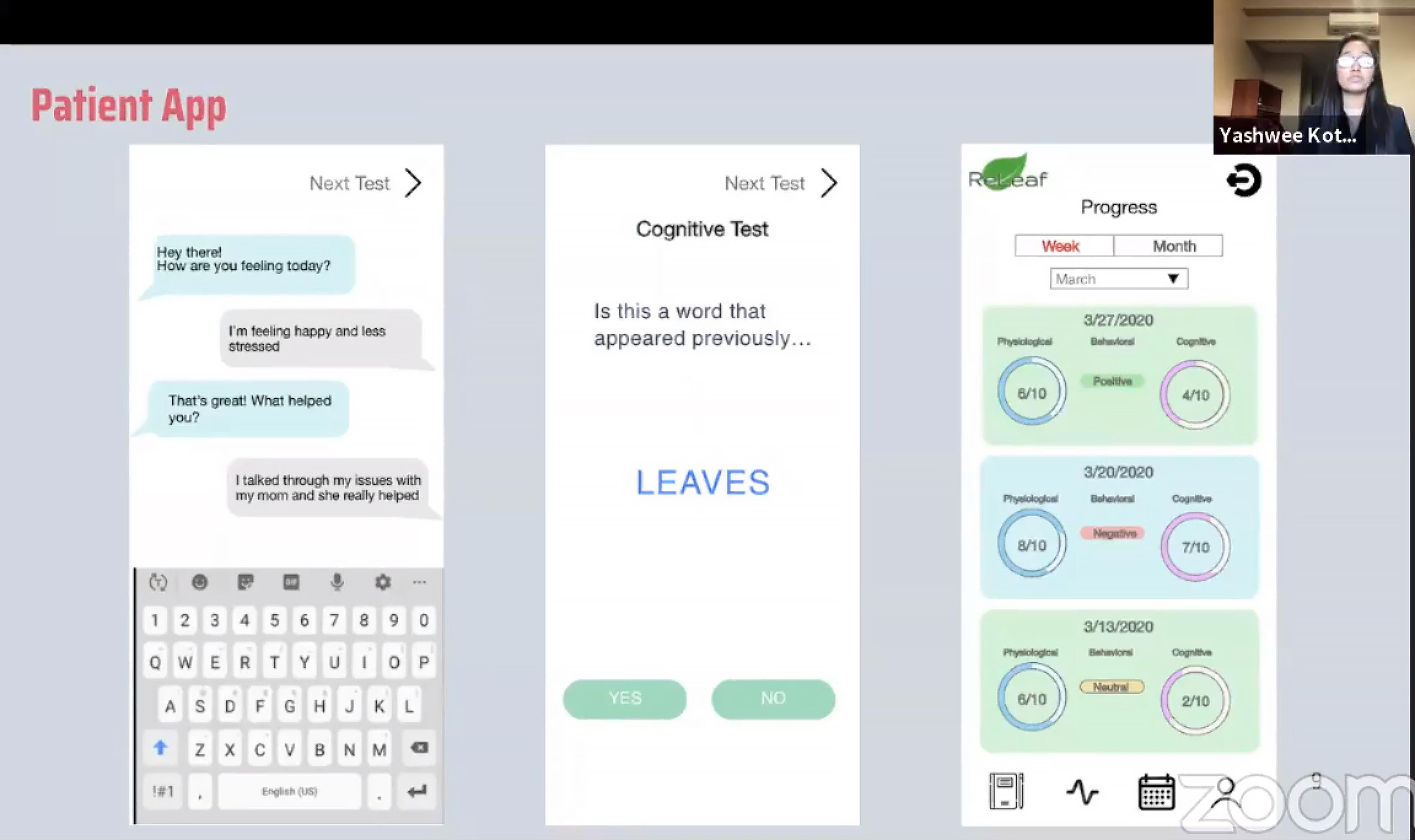 Releaf works to help providers better connect with patients and track their TBI symptoms between in-person examinations. Using the app, health care providers can conduct real-time check-ins, helping deliver an enhanced level of interaction that can result in improved treatment outcomes. The interface has been designed specifically to accommodate the needs and possible limitations of TBI patients.