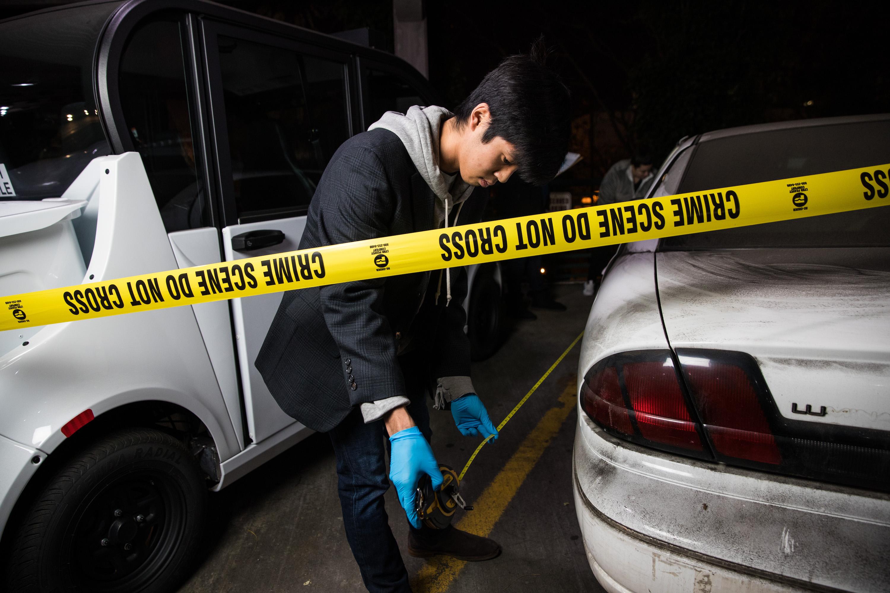 From the car’s exterior to its interior, the student-investigators spent most of their three-hour class systematically documenting and processing every inch of the scene using their training this year — including applying their understanding of detailed scientific note-taking methods for recording measurements of the environment around the vehicle, sketching and forensic photography used for court records, as well as applying skills and knowledge in latent print development, blood reagents and the use of special lighting sources.