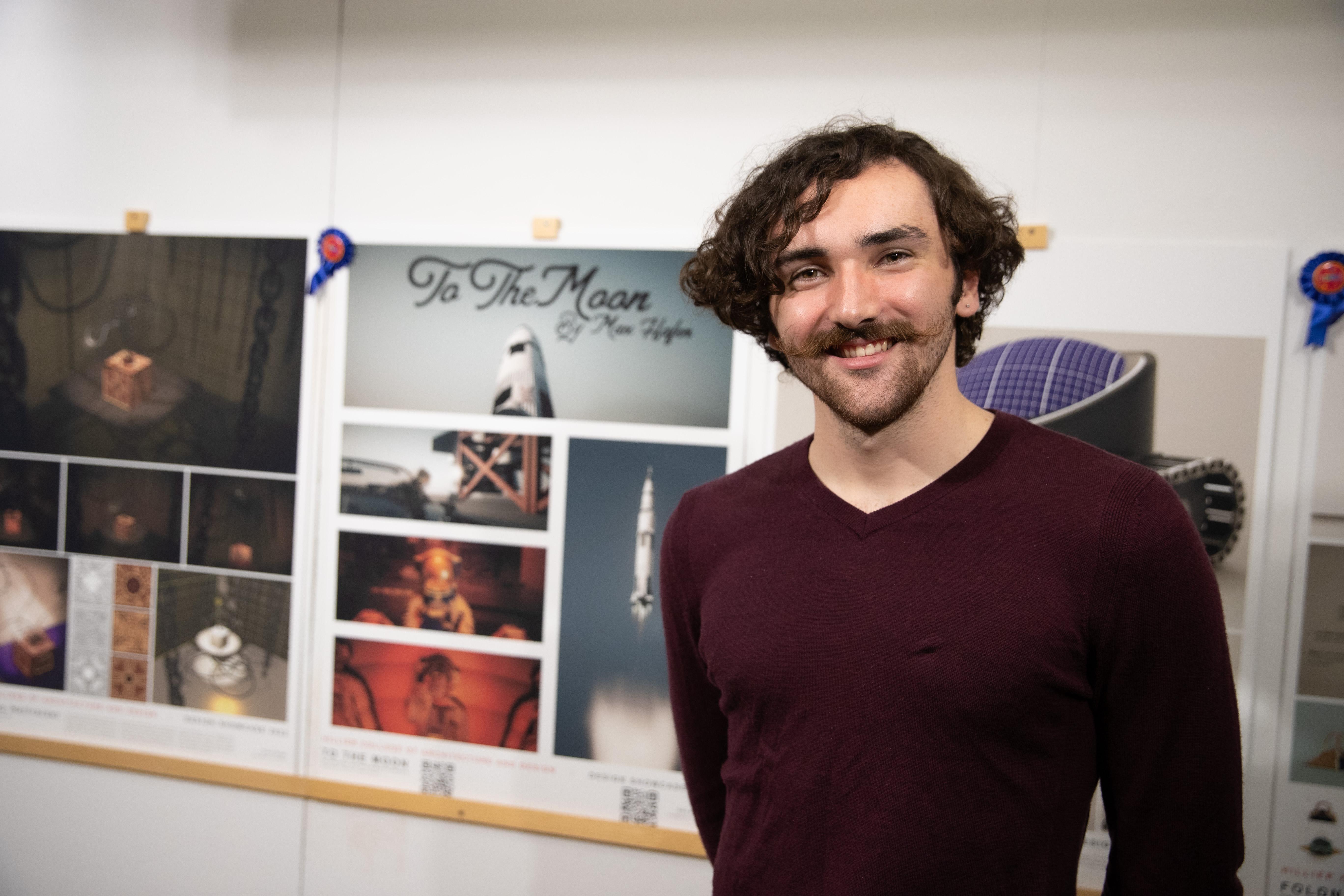 Senior digital designer Max Hafen was awarded for his animation project “To the Moon.” Inspired by hearing Frank Sinatra’s 1964 recording of “Fly Me to the Moon,” Hafen’s animation takes us on a period-piece journey of an astronaut preparing for launch, and showcases exceptional detail of model interaction with light, shadows, reflections and refractions. Much of his work on this project was a technical exercise in creating a framework for automated adjustments if he changed the environment — if Hafen changed the position of the sun, the shadows within the environment should reflect this change, instead of needing to reanimate individual objects from within.