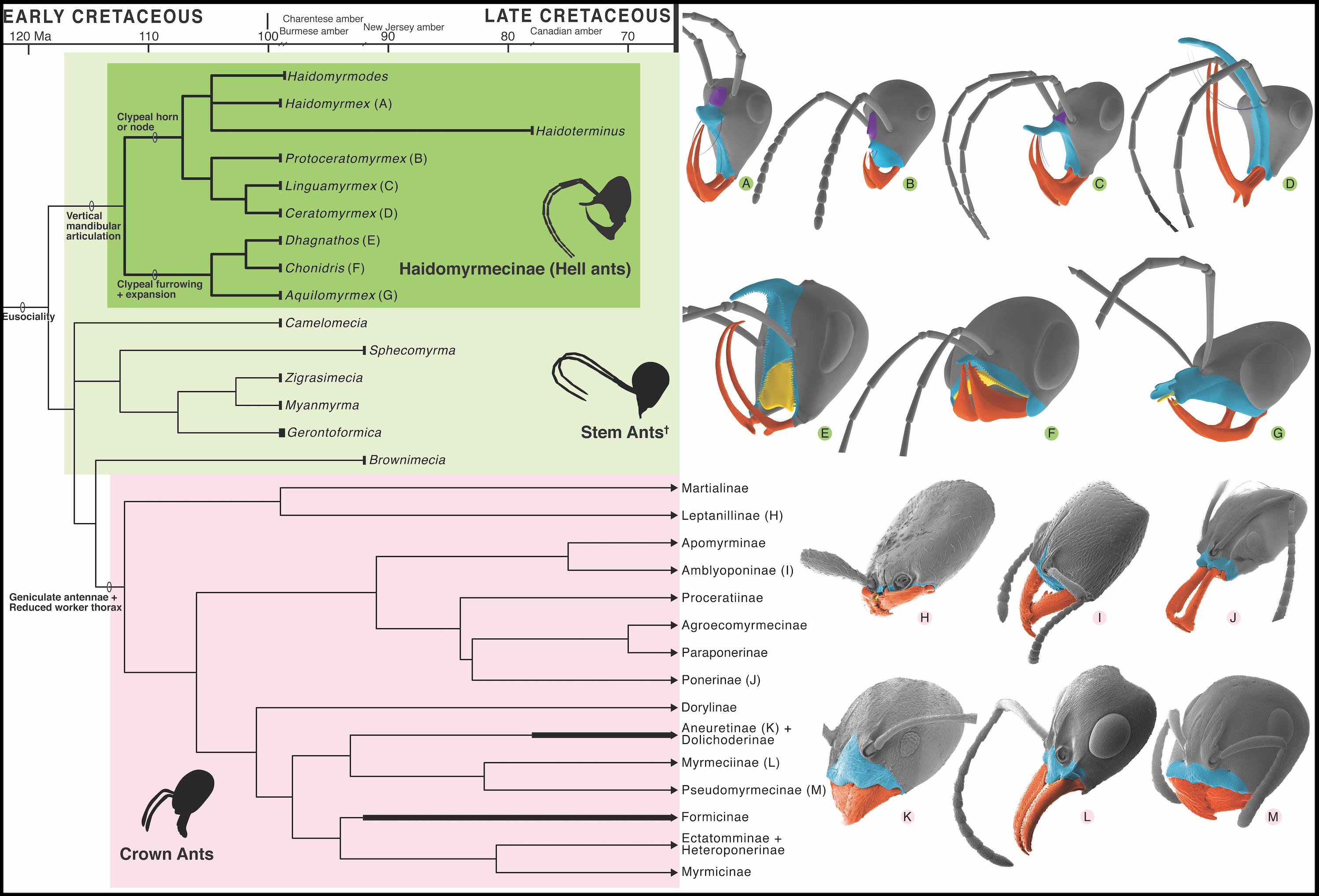 Above: Phylogeny and Cephalic Homology of Hell Ants and Modern Lineages. (Credit: NJIT, Chinese Academy of Sciences and University of Rennes, France)