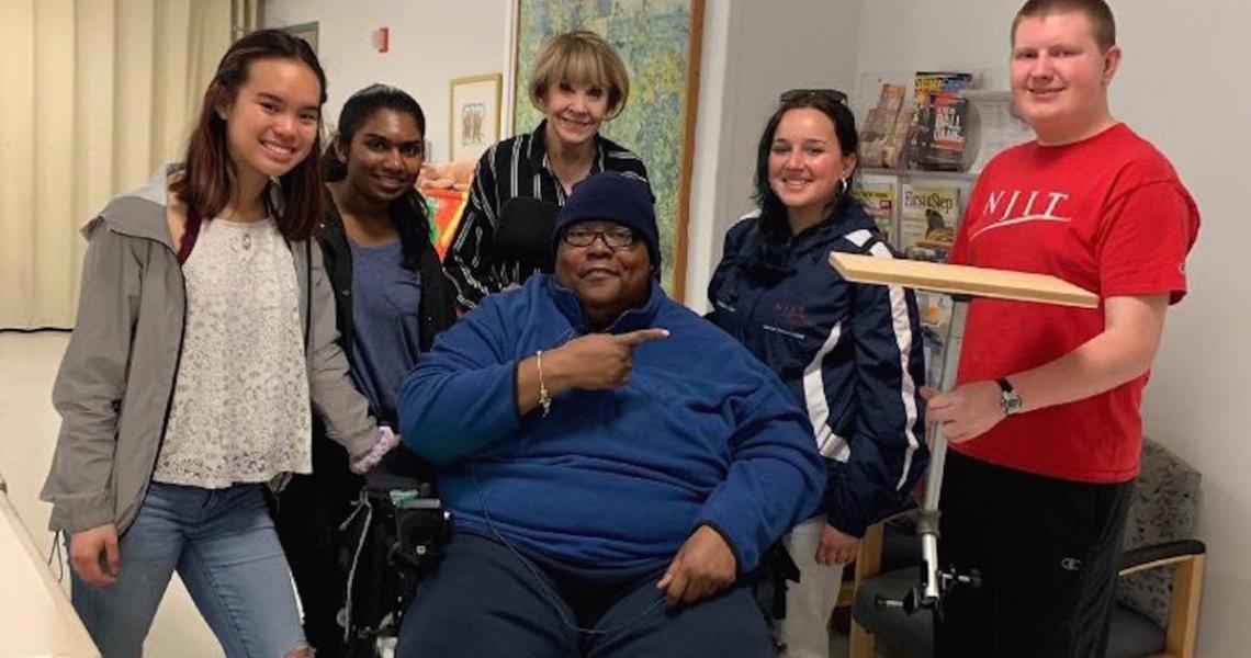 Led by Lauren Hutnik, now at Rutgers New Jersey Medical School, the ADHC team included Birju Dhahuk, Thinuri Fernando, Joshua Gaughan, Zean Go, Ryan Madden, Sandra Raju, Tyler Rodriguez and Sophia Tran. The group conducted site visits and interfaced with Abraham, Rupert and the handi-capable wheelchair user, Stephanie (pictured above with the students and Rupert), to develop the project plan and then create and test the tap-dance board.