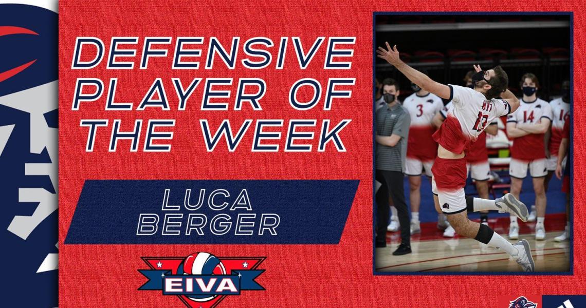 Graduate student Luca Berger has been selected EIVA Defensive Player of the Week for the second consecutive week the league office announced on Monday.