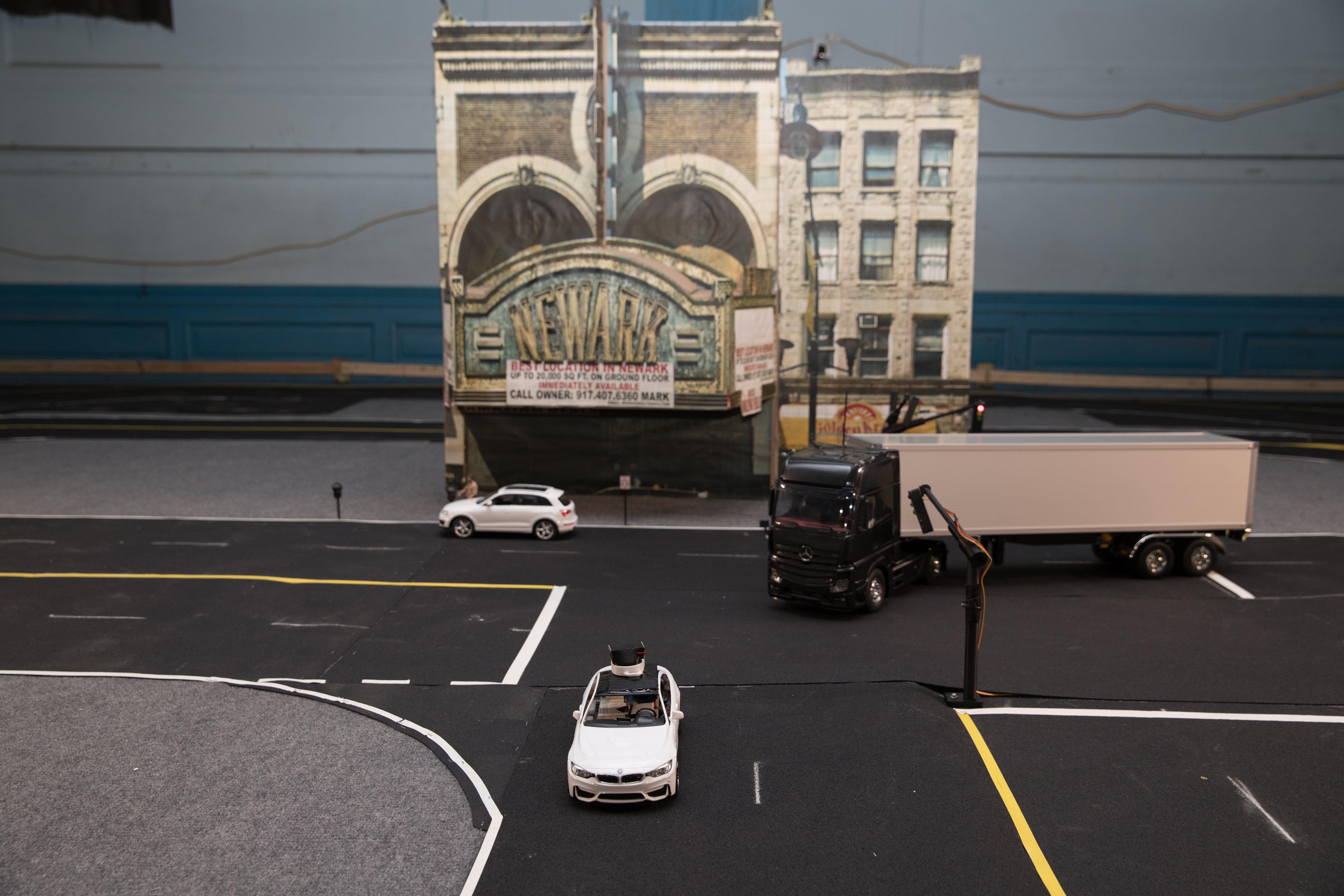The cars tool around Assistant Professor Cong Wang’s Control Automation Robotics Lab, where they are guided by remote drivers at gaming-style steering wheel and pedal control stations; they are then deployed on the streets of a miniaturized Newark, N.J., where they will share the right of way with autonomous cars controlled by computers and remotely operated pedestrians. Three tiny video cameras, facing in different directions, sit in the driver position of each remotely steered car and a lidar scanning range finder spins on the roof to continuously survey the surroundings so drivers can respond to conditions on the road.