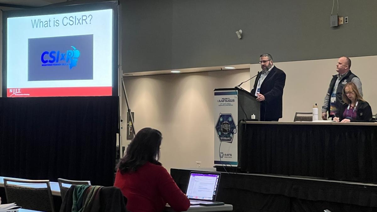 NJIT faculty and students presented on advances shaping the world of forensics, from research that could improve how forensic scientists estimate a person’s age at death, to technology demos of CSIxR — a virtual reality (VR) application developed at NJIT that simulates crime scenes scenarios to train crime scene investigators (CSIs).